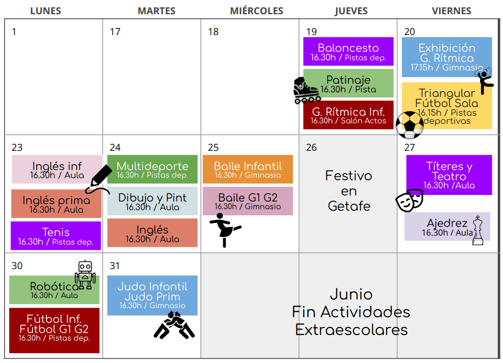 Adicionalmente, el viernes 20 a las 16:15 se celebrará en las pistas deportivas un torneo triangular de fútbol sala en el que participarán equipos de dos colegios más y una exhibición de gimnasia rítmica en el gimnasio a las 17:15.