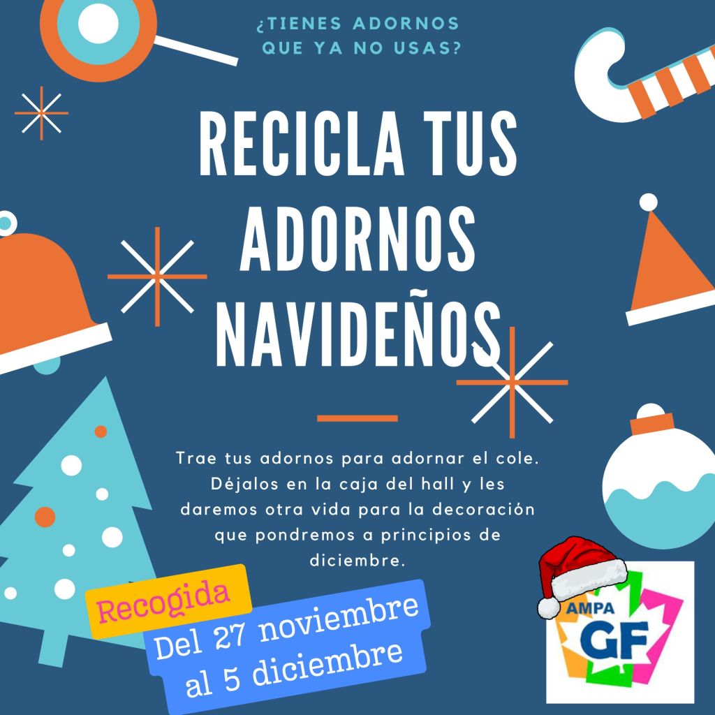 Este año os pedimos ayuda para decorar la entrada del cole con adornos navideños que tengáis en casa y que ya no utilicéis. Los vamos a Reutilizar en el hall y les daremos otra vida.