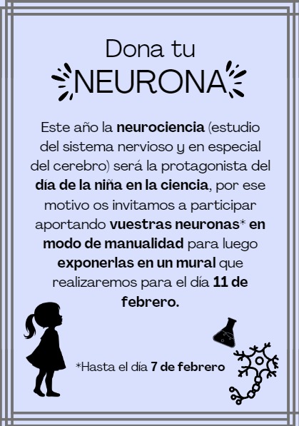 Este año la neurociencia (el estudio del sistema nervioso y en especial del cerebro) sera la protagonista del día de la niña en la ciencia (11 de febrero), por ese motivo os invitamos a participar aportando vuestras neuronas ( hasta el 7 de febrero) en modo de manualidad para luego exponerlas en un mural que realizaremos para el día 11 de febrero.
