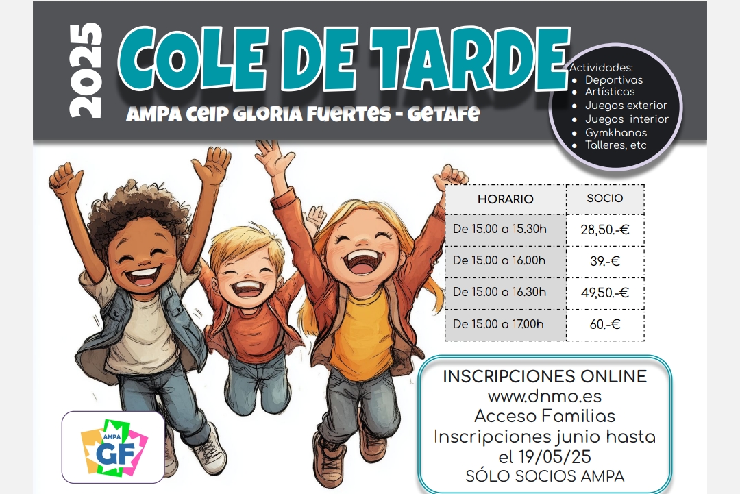 ¿Te apuntas al cole de tarde de junio? A finales de mayo terminan las actividades extraescolares y se ofrece el cole de tarde para complementar el horario desde las 15 a las 17 horas, de lunes a viernes. Recordad que es necesario ser socios del AMPA para poder inscribirse a las actividades.